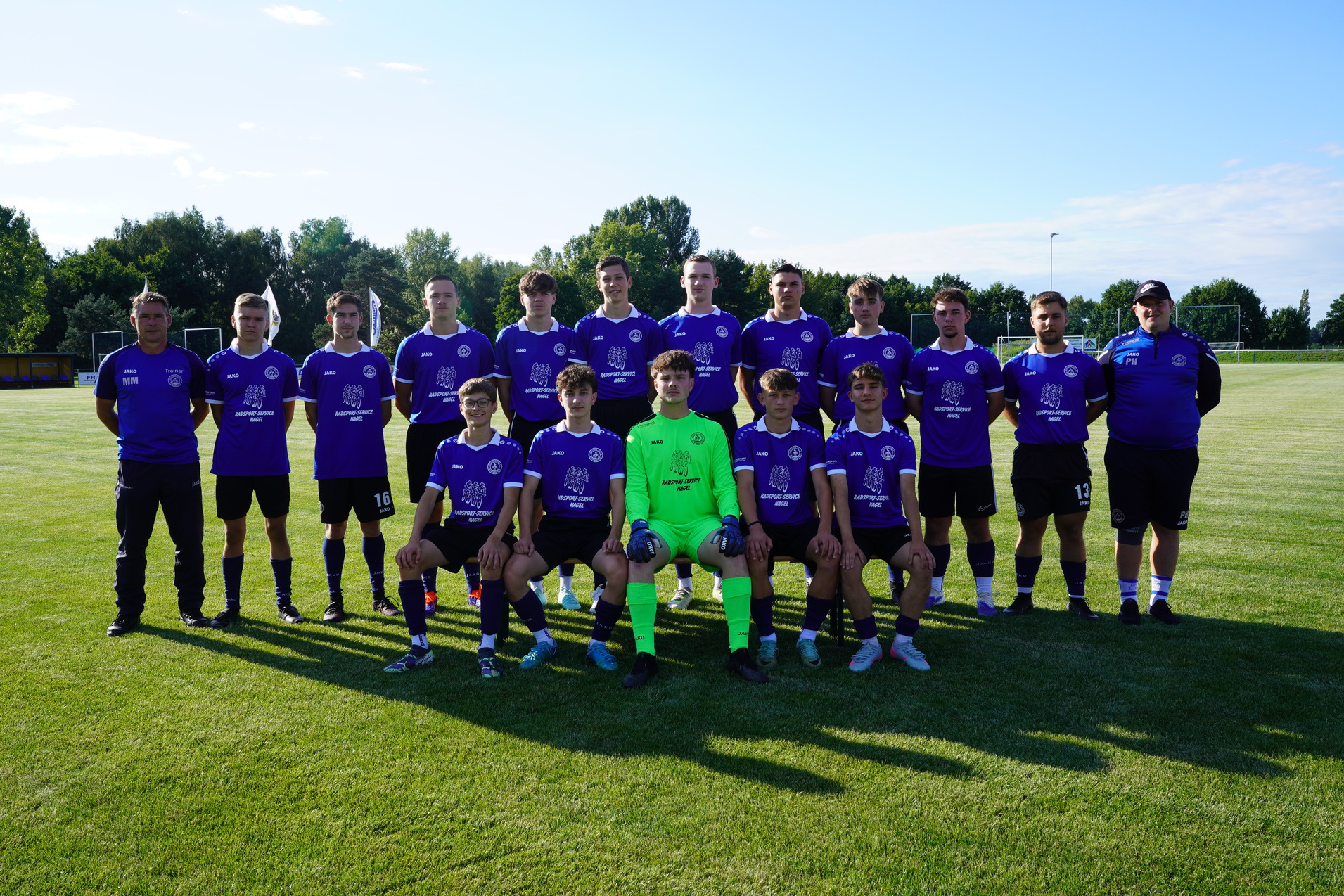 hintere Reihe (v.li.): Marco Müller (Trainer), Bennit Altkrüger, Julian Pötzsch, Niclas Genzer, Tom Weidmann, Cedric Buhse, Luca Robel, Lennox Balisch, Toni Mangelsdorf, Arne Menz, Brian Stendel, Philip Haufschild (Trainer)